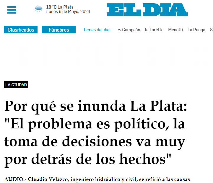 Medios GráficosEl Día: Por qué se inunda La Plata: «El problema es político, la toma de decisiones va muy por detrás de los hechos» Ingeniero Claudio Velazco2 años atrás1 año atrás01 minutos ACCEDER A NOTA Comparte esto: Compartir en X (Se abre en una ventana nueva) X Comparte en Facebook (Se abre en una ventana nueva) Facebook Me gusta esto:Me gusta Cargando... Relacionado Navegación de entradas Anterior: ¿Por qué se inunda el Conurbano?Siguiente: Clarín: Por qué siempre se inunda La Plata: lo que falta hacer más allá de una foto Deja un comentarioCancelar respuesta
