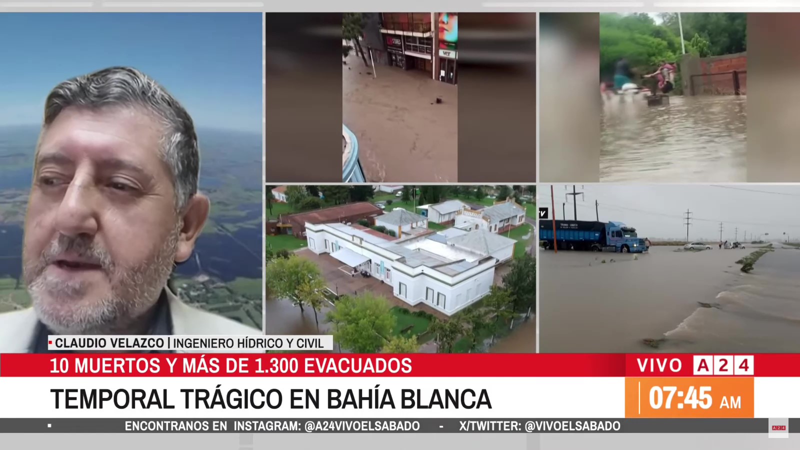 Televisión y RadioINUNDACIONES EN BAHÍA BLANCA – ENTREVISTA EN A24 – VIVO EL SÁBADO Ingeniero Claudio Velazco1 año atrás1 año atrás01 minutos Comparte esto: Compartir en X (Se abre en una ventana nueva) X Comparte en Facebook (Se abre en una ventana nueva) Facebook Me gusta esto:Me gusta Cargando... Relacionado Navegación de entradas Anterior: Clarín- Inundación en Bahía Blanca: llovió lo mismo que en la tragedia de La Plata, hace 12 añosSiguiente: Inundación en Bahía Blanca: entrevista en Radio Nacional Deja un comentarioCancelar respuesta
